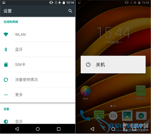 系统设置菜单使用浅色主题,并引入搜索功能。Moto X 极并没有像其它采用AMOLED屏幕的手机那样,将系统设置菜单变成黑色。另外,长按电源键依然没有“重启”开关,只有“关机”这个原生Android的小缺陷也一并继承下来了。