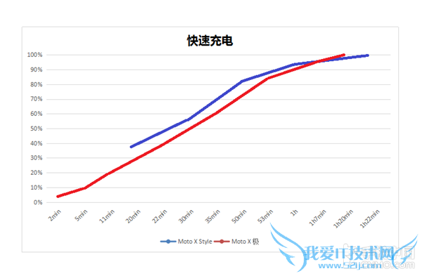需要说明的是,两台手机选取的记录时间节点是不一样的,本次对比主要从宏观上进行分析,而不是具体到每一个时间节点上的对比,毕竟两块电池的容量还是有一定区别的。整体上可以看出,TurboPower涡轮快充技术并没有进一步提升,Moto X Style整体曲线相比电池容量更大的Moto X 极更加陡峭,但是在充入最后5%电量中被Moto X 极反超,Moto X 极率先完成100%的电量充满。换句话说,两台旗舰机都发挥了TurboPower涡轮快充技术正常的水平。