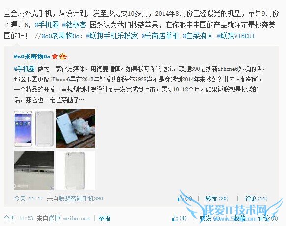 由于即将要发布的新机Sisley(S90)太像iPhone 6,联想在微博上遭到了很多网友的质疑,认为其抄袭苹果的设计。刚刚,联想官方产品内测平台@神机工场对此进行了回应。他们表示,全金属外壳手机,从设计到开发至少需要10多月,S90是2014年8月份已经曝光的机型,苹果9月份才曝光iPhone 6,居然认为我们抄袭苹果,在你眼中中国的产品就注定是抄袭美国的吗?
