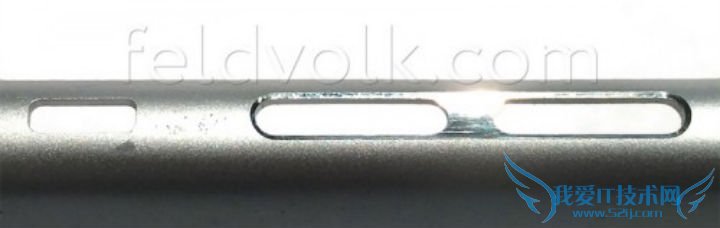 当然,镂空带来的问题在于,一体式阳极电镀铝后盖的坚固性遭到削弱。镂空部位集中于一个狭窄的水平带,这意味着对手机顶部或底部用力会特别有效地作用于那个区域,从而产生弯曲。从以下这张后盖照片中,可以看到音量键镂空处周围只剩下很少的实体部分: