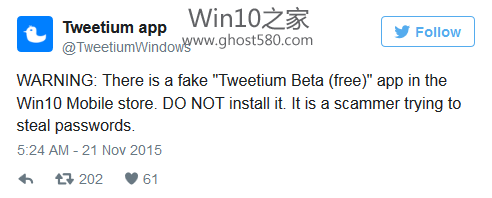 Win10之家讯 11月22日消息,据cnbeta报道,外媒称日前一款假冒的Tweetium Beta软件出现在Windows 10 Mobile软件商城中,换言之,这是一款被官方认证了的假冒软件。更糟糕的是,这款软件还是一款恶意软件,专门用于诈骗、盗取用户密码。Tweetium官方在Twitter上向用户发出警告:“警告:Win10 Mobile软件商城中出现了一款假冒的'Tweetium Beta(免费)'。请不要安装。它是一个将盗取(你)密码的诈骗软件。”