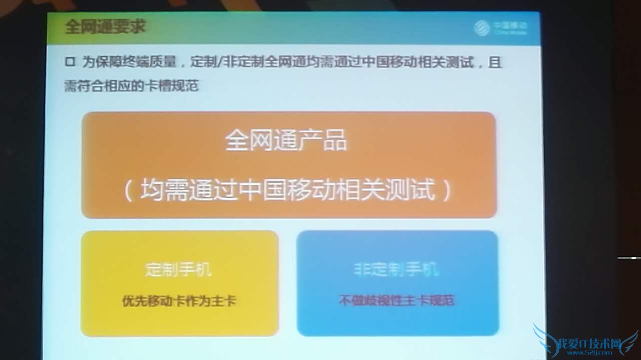 在此次会上,马景新表示中国移动的全网通要求是:为保证终端质量,定制/非定制全网通均需要通过中国移动相关测试,且需符合响应的卡槽规范(定制手机优先移动卡位主卡,非定制不做歧视性主卡规范)。