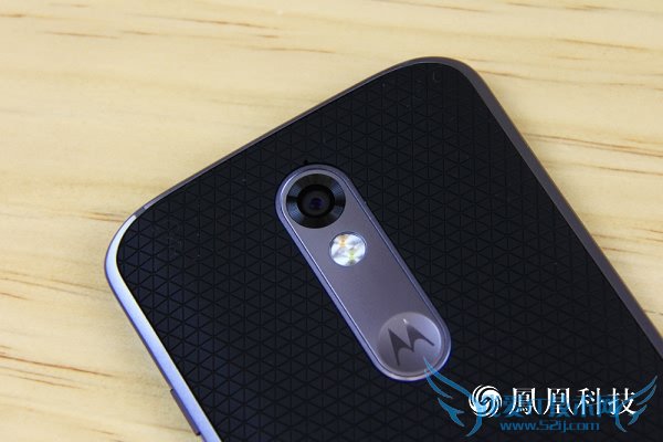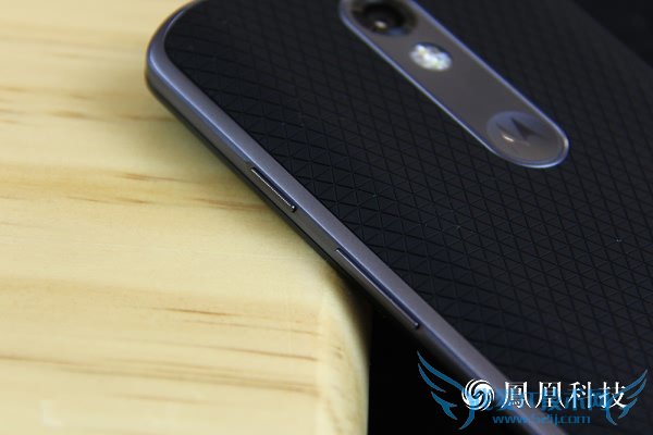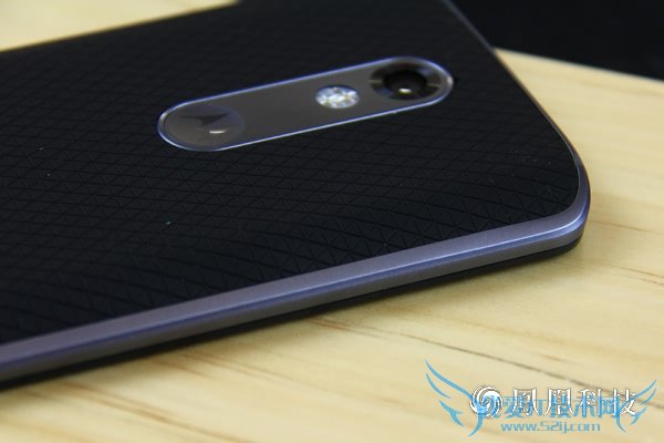 Moto X 极背面采用了橡胶材质覆盖背壳表面,并且橡胶表面还刻有三角形的纹路,而顶部是和Moto X Style相同的设计,摄像头、双色温闪光灯以及Moto的品牌logo都在同一个装饰条上,这也可以看做是这一代Moto机型的家族式设计。而且其他地方确实比较简洁。