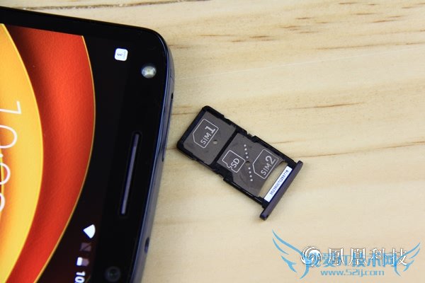 Moto X 极采用了深灰色的金属中框,看起来很有质感,也显得很硬朗。不过为了实现“摔不碎”的终极目的,其中框并没有包裹住前面板,所以从侧面看Moto X极能看到前面板的烤漆黑色也能看到深灰色的金属中框。Moto X 极非常个性的将SIM卡槽放在了机身顶部,打开之后我们发现这款机型不仅仅支持双卡双待,而且卡2的位置还兼容microSD卡,这一点还是显得挺厚道的。