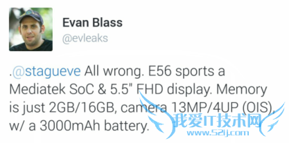 11月10日凌晨,爆料大神evleaks却反转了以上消息,据他最新发布的推特,E56将采用联发科的SoC,5.5英寸FHD屏,2GB RAM+16GB ROM,前置400万像素摄像头,后置1300万像素摄像头,支持光学防抖,容量电池为3000mAh。他在推特中称,“All wrong(你们都说错了)”。同时,LlabTooFeR还曝光了X9的发布时间——2016年第一季度,至于X9的定位嘛,则比HTC One A9还低一个档次。