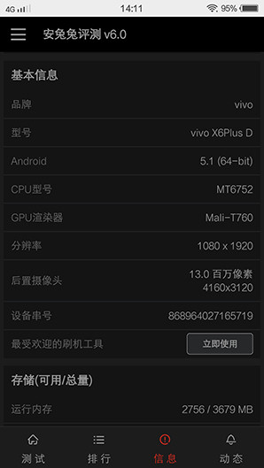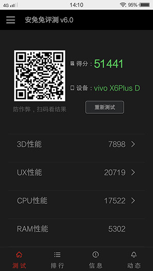 不过,与vivo X6不同,售价更高的vivo X6Plus(双4G版)拥有64GB超大机身内存,即4GB RAM+64GB ROM组合,突显了加强版优势,能够为用户存储更多文件,哪怕是高清电影也不是问题。至于处理器方面,这款手机则同样搭载64位八核处理器(MT6752),谈不上出众,不过得益于4GB超大运存,安兔兔跑分依然在5万分以上,更重要的是整体操控体验流畅自然,不输于其它旗舰机型。
