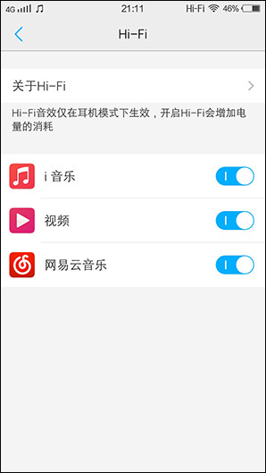 为了配合硬件层面的音频芯片,vivo X6Plus(双4G版)软件层面也做了特别的优化,如下图所示,用户可以手动开启“Hi-Fi音效”(仅在耳机模式下生效)以及“K歌之王”功能,进而获得不一样的声觉体验。以“i音乐”为例,开启“Hi-Fi音效”之后,声音更加浑厚、饱满、响亮,极具现场感,优势颇为明显,哪怕你是普通的小白用户也能够体会出vivo X6Plus Hi-Fi音效的魅力所在。