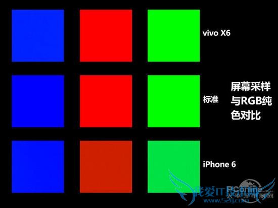 从纯色对比图中,vivo的屏幕色彩还原比较准确,只是红色、绿色比标准的略微暗淡。此外,由于AMOLED采用自发光材料,它根本不需要背光辅助,所 以图像显示黑色时,屏幕实际上和关闭没有区别,这样不仅黑色亮度会大大降低,而且因为省去了背光装置以及发光二极管,AMOLED功耗也比LCD要低不 少。