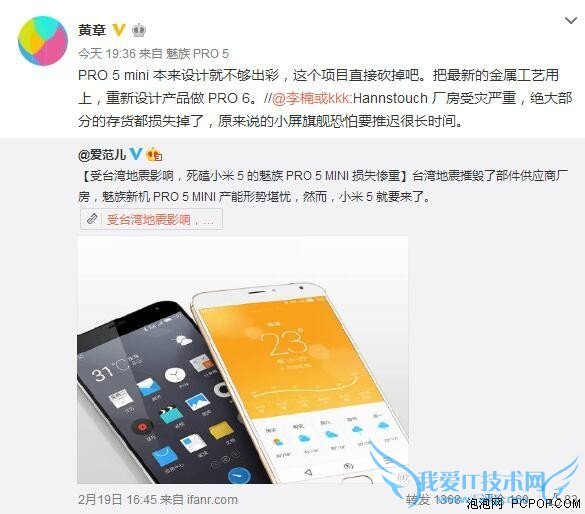 不过天有不测风云,日前发生在台湾的地震不仅影响了众多台湾民众的生活轨迹,更是影响到了魅族的更新计划。近日有媒体曝出“受台湾地震影响,魅族PRO 5 mini损失惨重”表示台湾地震摧毁了部件供应商厂房,魅族新机PRO 5 mini产能形式堪忧。魅族副总裁李楠在微博上对该消息并没有避讳,进行了转发且表示:“和鑫光电(Hannstouch)厂房受灾严重,绝大部分的存货都损失掉了,原来说的小屏旗舰恐怕要推迟很长时间。”
