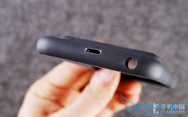 正面看起来像苹果官方的硅胶保护壳,尤其是丝绒内里和侧面按键的设计简直如出一辙,只是在手机壳的下方加长了“下巴”,多出来一个扬声器和话筒接口。由于“长下巴”,耳机口变得又深又窄,不是所有第三方耳机都能顺畅的插进去,Earpods插进去后基本就露出一个尾巴。