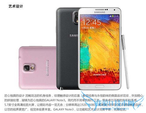 三星Note 3机身材质将以往塑料背改为极具质感的皮革材质,边缘缝纫的痕迹将产品提升一档。整机外观改良是该机一大亮点,8.3mm厚度,重量168g,尺寸增加的同时,整机却又轻又薄;5.7英寸1080P显示屏,画质的细腻、色彩的真实度着实让人惊艳;硬件配备较以往提升不少,三星 Exynos 5 Octa 5420处理器,3GB+16G存储组合,配合Android 4.3操作系统,整机运行速度毋庸置疑;后置1300万像素,前置200万像素摄像头组合,使得Note3拍摄效果再提升一档。