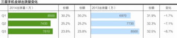 高端市场遭遇大屏幕iPhone 6,中低端市场被崛起中的中国手机厂商冲击,三星的全球市场份额逐渐缩水。根据著名分析机构IDC报告,2014年前三季度,三星智能手机全球市场份额分别减少1.7%、7.1%、8.7%。