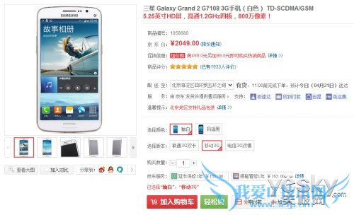 三星Galaxy Grand 2 G7108是三星手机家族中极具代表性一款智能手机,该手机可支持TD-SCDMA与GSM制式,是目前三星在中国市场推重的一款中端产品。目前这款手机正以2049元的价格在京东商城热销,对于那些有购买需求的朋友不妨关注一下。