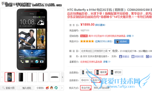 京东商城 HTC Butterfly S电信版 售价1899元 包邮