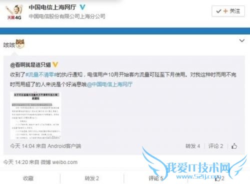 该微博发布后,@中国电信上海网厅转发了该微博,并回复“咳咳”两字。很多网友认为,电信流量不清零的消息应该基本属实。