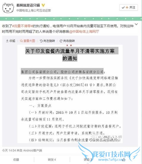 9月14日消息,今日下午两点,微博认证为“中国电信上海公司互动运营”的网友@看啊就是這只貓晒出了一张中国电信内部的执行通知,通知中明确表示,从10月1日开始,中国电信所有手机上网按流量计费的月套餐用户,如果当月套餐流量未用完,可转至下个月继续使用。