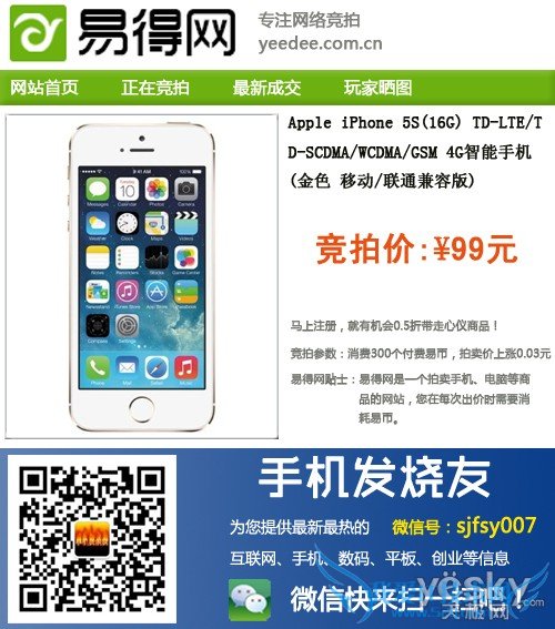编辑点评:iPhone5S相对于iPhone 5,在外观方面变化不大,但是内在升级较大,性能提升很多,特别是指纹识别比较高端洋气。近日iPhone5S土豪金在商家“易得网”【www.yeedee.com.cn】的秒杀价仅99元。喜欢的朋友一定不要错过!
