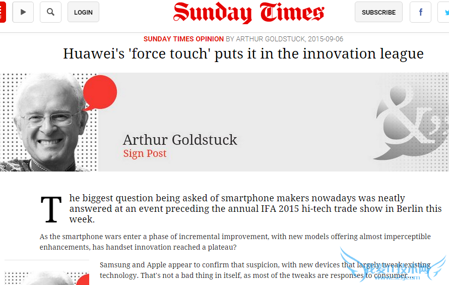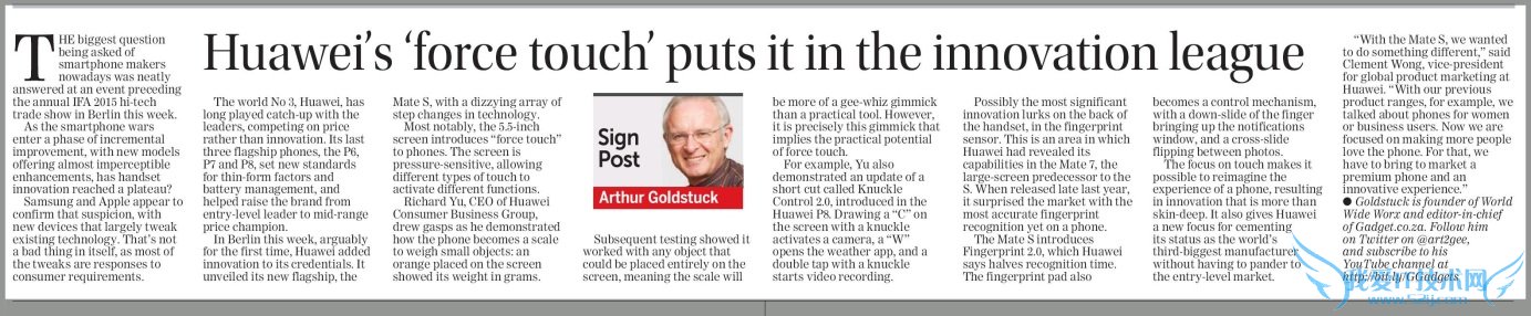 导语:The Sunday Times一直被认为是英国第一主流大报,被誉为“英国社会的忠实记录者”,该报于9月6日对华为Mate S及其按压触控技术做出报道,文章认为,Mate S“在技术方面做出了一系列令人惊艳的重大改进”,并高度评价Mate S的按压触控技术“拥有实际广泛的潜在用途”。