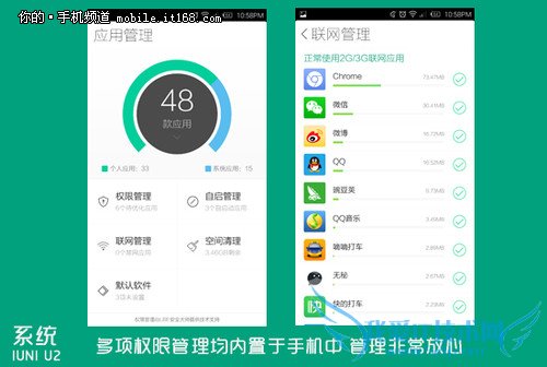 同时,在常规的功能上IUNI OS也同样一个不少。诸如联网设置,应用程序权限设置也都非常实用。可以说,在大部分时间下,IUNI OS属于极度精简,但却极度实用的水平。