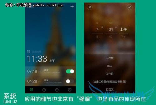 所以综上所述,IUNI U2在系统上的表现极度创新。这种创新,一方面体现在想法上,精简系统的理念无疑是于时下主流ROM方案背道而驰;同时创新还体现在视觉上,虽然同为扁平化,但是却将后台和功能键整合、内置的时光锁屏更是极尽清新,彰显着其有品的特性;而在常规应用上,IUNI OS也在人性化这一环节做着新的尝试,闹钟功能的贴心效果就是个不错的例子。而作为一家仅有一款产品面世的厂商来说,这些都是其值得令人记住的闪光点。