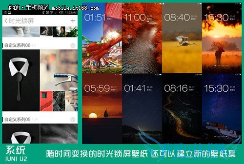 同样也是UI设计方面,此次IUNI OS内置了“时光锁屏壁纸”功能。在该功能下,系统会定时更换锁屏壁纸。而系统除了自带的三套清新壁纸,还支持自定义图集设为壁纸集,在传统的锁屏模式下加入了趣味性。