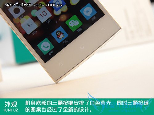 机身底部为经典的安卓三实体触控键,同时采用了白色的背光设计。不过需要注意的是IUNI的三个按键图标进行了重新绘制并且辨识度不高,所以返回键和菜单键初一上手还需要一个适应过程。另外按键背光在非操作情况下不会亮起,各位也需要注意。