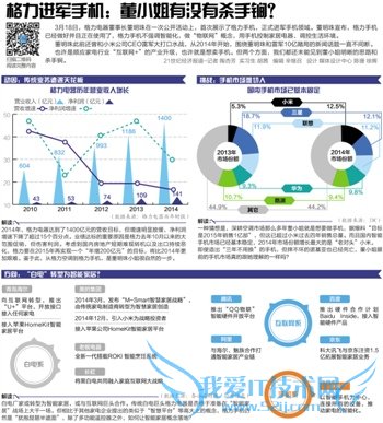 格力电器2014年营业收入已达到1400亿元目标,但是营收增速、净利润增速明显下滑。仅靠以人力、销售为驱动不足以支撑企业继续快速发展。格力进军手机,并非抛弃空调主业,更有可能是将手机作为智能家居中,与空调等家电相结合的智能终端设备。