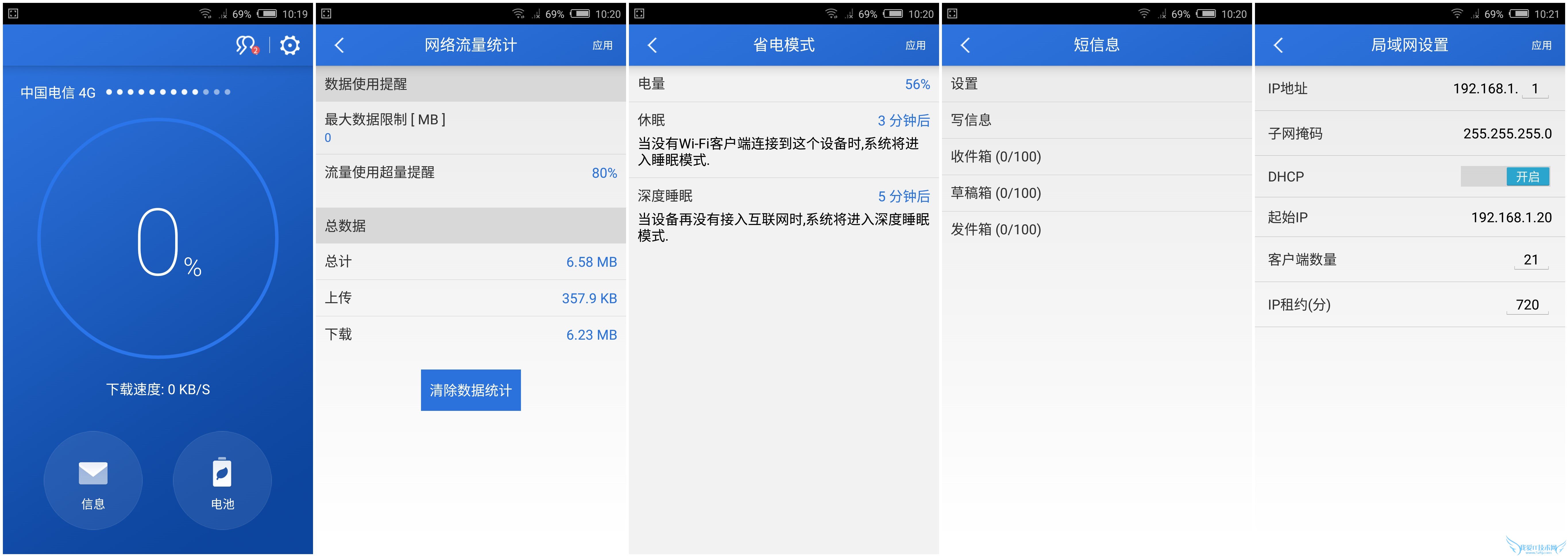 APP界面十分简洁,可以查看状态信号,实时网速、信息和电量,另外设置界面可以设置省电模式和流量总量等。
