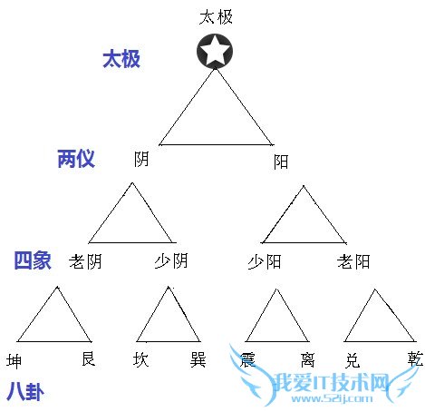 而杨辉三角恰恰代表了太极->两仪->四象->八卦的推演过程,如下图: