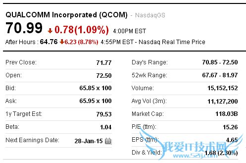 2015财年第二财季:高通预计总营收在65亿美元至71亿美元之间,同比增长2-12%。基于GAAP,每股摊薄收益在1.08-1.20美元之间,同比下滑5%至增长5%。