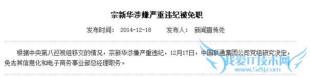 科技讯 12月18日早间消息,中国联通官网消息显示,根据中央第八巡视组移交的情况,宗新华涉嫌严重违纪,12月17日,中国联通集团公司党组研究决定,免去其信息化和电子商务事业部总经理职务。这也是继几日前张智江被调查免职之后,中国联通第二位落马高管,中国联通陷入反腐风暴。