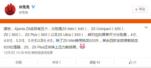 微博用户安兔兔表示:据悉,Xperia Z6成员有五个,分别是Z6 Mini(X45)、Z6 Compact(X55)、Z6(X60)、Z6 Plus(X65)以及Z6 Ultra(X50),其对应的屏幕尺寸分别是,4寸、4.6寸、5.2寸、5.8寸以及6.4寸。除了Z6 Mini使用骁龙620外,其余四款全部搭载骁龙820处理器,Z6、Z6 Plus还会换上压力触感屏。