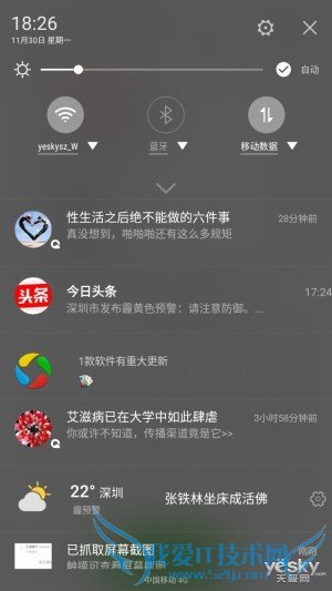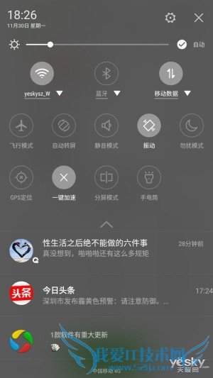 从屏幕顶部向下滑动,除了显示时间日期以及SIM卡状态之外,还默认显示通知消息和三个快捷开关,用户可以根据个人使用频率来自定义三个快捷开关,再进行一次下拉,可以显示全部快捷开关。长按Home键可以打开最近打开的应用,以卡片形式显示,方便用户在多个应用之间快速切换,提高操作效率。用户还可以向上滑动卡片关闭该后台应用,向下滑动卡片锁定该后台应用,一键清除后台应用时不会被清除。