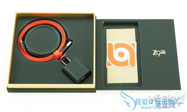 nubia Z9 Max精英版采用低调神秘的黑色包装盒,正面正中央银色nubia的logo很显眼,包装盒带轻微磨砂效果,手感很好。揭开盒盖后,土豪金色nubia Z9 Max精英版展现在眼前,里面是两层式设计,下面一层是附件,包括充电器、数据线、标牌、说明书保修卡、卡针等,没有附送耳机,现在国产厂商几乎都不再附送耳机了。