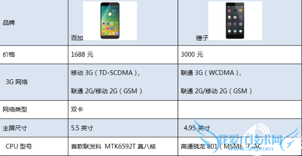 “锤子”手机采用了高通骁龙801平台MSM8274AC四核2.5GHz处理器(与小米3联通版相同),百加手机搭载了全球首款MTK6592Turbo 2.0GHz真八核CPU。