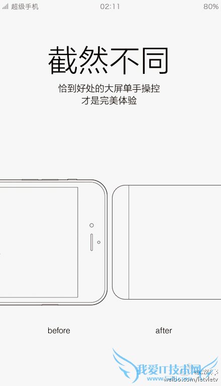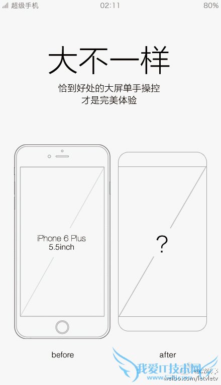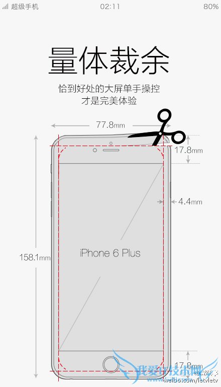 此前贾跃亭就曾表示:“颠覆性的大屏单手完美操作,一定是基于对屏+ID的极致追求,一定是基于对手持握感的万千斟酌,一定是基于对奢侈科技的不懈努力,但一定不是iPhone 6 Plus这样。无致敬之嫌,也无哗众之意,做最好的自己,就是要大不一样。”iPhone 6 Plus的三围尺寸为158.1x77.8x7.1mm,乐视超级手机在它的基础上“裁”了一圈,仅宽度就窄了8.8mm,从而更加适合单手操作。