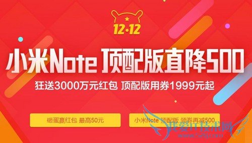 5月6日,小米Note顶配版正式在北京发布,该机搭载高通骁龙810八核64位处理器,采用4GB LPDDR4运行内存等强劲的配置,售价2999元起。近日,小米宣布在双十二期间,小米Note顶配版直降500元,双十二当天领券更可再减500元,最终售价仅1999元起,相当劲爆。另外在活动期间,小米官网全系手机现货购买,更有3000万元现金红包等待大家抢购。