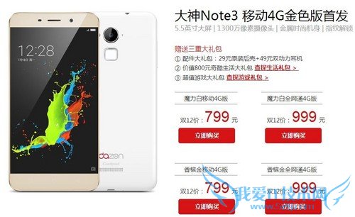 大神Note3作为首款千元指纹手机而为人熟知,作为其升级机型,大神Note3金色版升级了指纹识别功能,更是搭载了360 OS,令该机在安全方面向前迈了一大步。双十二到来之前,大神为该机新增了移动4G版,售价仅799元,购机还赠送原装后壳+耳机的配件大礼包、价值800元的奇酷生活大礼包以及超值游戏大礼包三重大礼包,另外千万红包更是可以提前领。