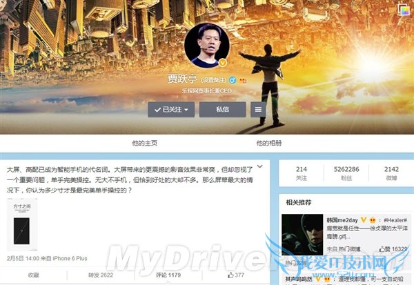 日前,乐视CEO贾跃亭在微博上对自家的智能手机进行造势,并询问网友单手操控的最佳尺寸是多少。
