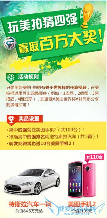 6月16日美拍推出的#美拍世界杯#活动,再次放出重磅炸弹:不仅在内容上满足了大众对世界杯竞猜的创意热情,还准备了非常吸引人的奖品:极客的梦想座驾——新能源汽车特斯拉,而且不是汽车使用权,而是送真车。据悉这款车的最基础配置也要64.8万,同时还有110部最强夜间拍照手机——美图手机2,奖品总额近百万,而且全程由第三方监督。活动细则一出,就在微博微信上引起广泛讨论。活动刚刚推出几个小时,就吸引了不少用户参与,还包括娱乐圈诸多明星参加,包括徐洁儿、王柯达、航悦老师等等,该活动最终用户参与量极有可能超越#全民社会摇#。