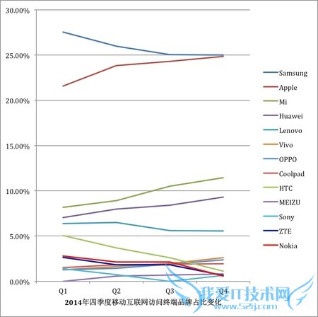 图:2014年各个季度移动互联网访问终端品牌占比变化