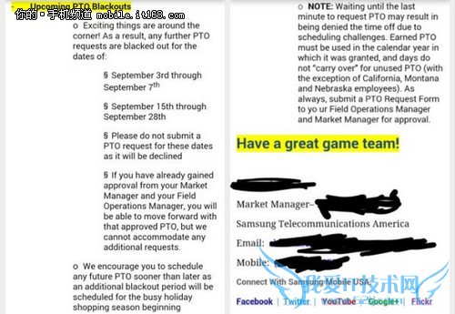 实际上,过去便传闻为了抢在iPhone 6之前问世,三星GALAXY Note 4将会加快上市的速度。根据韩国媒体ETNews此前的报道称,三星GALAXY Note 4将会进一步缩短发布于上市之间的时间,预计在新机发布后两周左右开卖。而现在,这种说法似乎得到了证实。根据国外网站Androidauthority援引三星内部线人的消息披露称,三星已经通知属下员工,9月15日-28日将会取消休假,所以结合三星GALAXY Note 4将于9月3日发布,然后在两周左右开卖的说法,9月15-28日这个时间段应该便是该机正式开卖的时间。