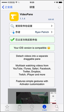 但很可惜VideoPane不是免费的,它在Big Boss源中售价1.99美金,也不太便宜,毕竟是给手机用的,各位权衡一下再下手购买,或者等待大神破解,土豪请自动无视。