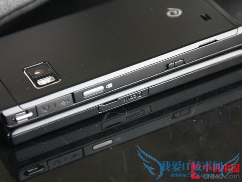 为了更好节约机身的空间,三星 W999的接口安排得很紧凑。microUSB数据口可以同时充当耳机插孔。除了电源键,我们在三星W999的右侧面还看到了一颗比较特殊的滑动式按键,这颗按键的作用是锁定/开启网络,以帮助用户更好控制网络的开关,是个很实用也很新鲜的物理按键。