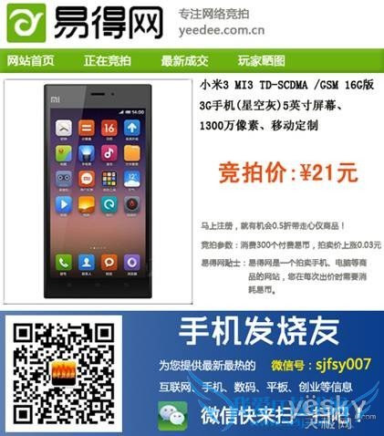 作为小米新一代旗舰,小米3一经发布便引起了极高的关注,该机拥有非常主流的硬件配置,出众的性能表现也让小米再度成功的赢得了消费者的喜欢。目前该机在商家“易得网”【www.yeedee.com.cn】 进行天天特价秒杀活动,上一期的网友秒杀价仅为21元,感兴趣的朋友赶紧来看看,惊喜不断哦!