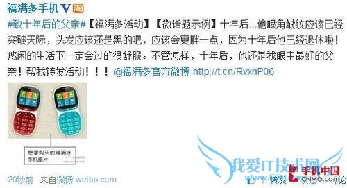 在小编详细看完介绍后,发现这款手机确实是让消费者自己来定价格,但却不是以讨价还价的方式。而是采用现在热门的新浪微博作为前沿阵地,发起了#致十年后的父亲#话题活动。