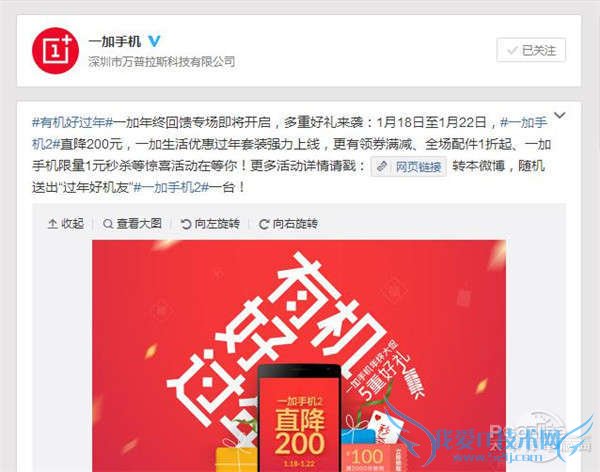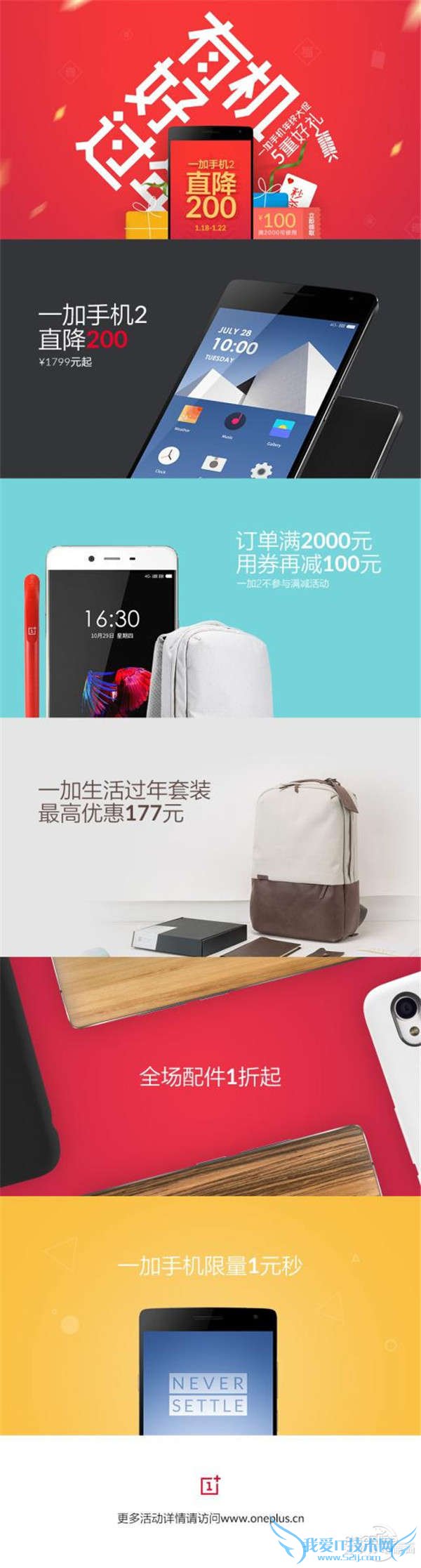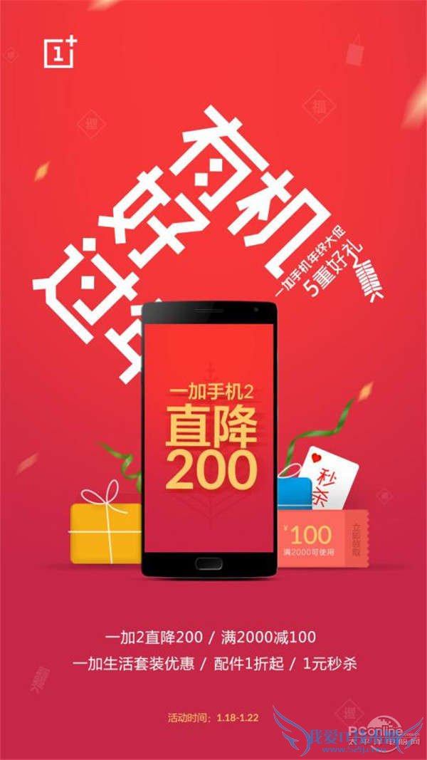 1月15日,一加手机官方微博公布一加手机将于1月18日至22日推出年终大促活动,一加手机2官网价格直降200元,还有五重春节好礼齐上线(官网活动地址:http://www.oneplus.cn)。本次大促活动包括5个方面:旗舰手机一加手机2直降200元,16G/64G版本分别售价1799元/2199元;每位用户可领取3张100元优惠券,每笔满2000元订单即可使用1张;备受好评的一加生活周边推出三款优惠套装,单个套装最高立减177元;全场配件1折起,一加手机一代、一加手机2、一加手机X的用户同享优惠;活动期间每天上午11点开启一元秒杀,一加手机2、金耳、限量版皮质双肩包等明星产品等你来秒!