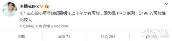 李楠透露,4.7英寸的小屏旗舰有可能明年上半年亮相,因为是PRO系列,售价2499元的可能性比较大。根据李楠的自曝,这款小屏旗舰的尺寸与此前外媒报道的一致,都为4.7英寸,但价格却有所不同,外媒称该机的起始售价为1999元,预计该机应该会有多个版本。