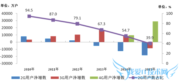 2015年,2G移动电话用户减少1.83亿户,是上年净减数的1.5倍,占移动电话用户的比重由上年的54.7%下降至39.9%。4G移动电话用户新增28894.1万户,总数达38622.5万户,在移动电话用户中的渗透率达到29.6%。