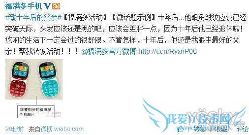 在小编详细看完介绍后,发现这款手机确实是让消费者自己来定价格,但却不是以讨价还价的方式。而是采用现在热门的新浪微博作为前沿阵地,发起了#致十年后的父亲#话题活动。